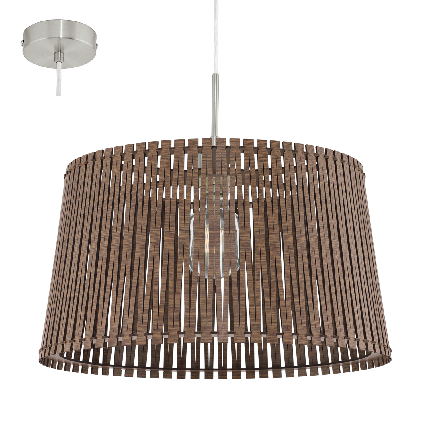 Colgantes de diferentes formas y colores hechos con lamas de madera. Disponibles en redondos y ovalados, con madera blanca, clara u oscura